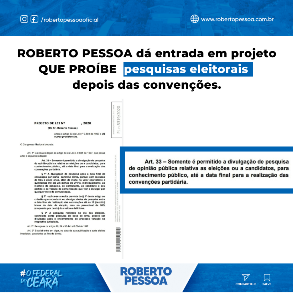 De volta à Brasília esta semana, o Deputado Roberto Pessoa deu entrada em um projeto de lei que permite a divulgação de pesquisa de opinião pública relativa as eleições ou a candidatos, para conhecimento público, somente até a data final para a realização das convenções partidárias.